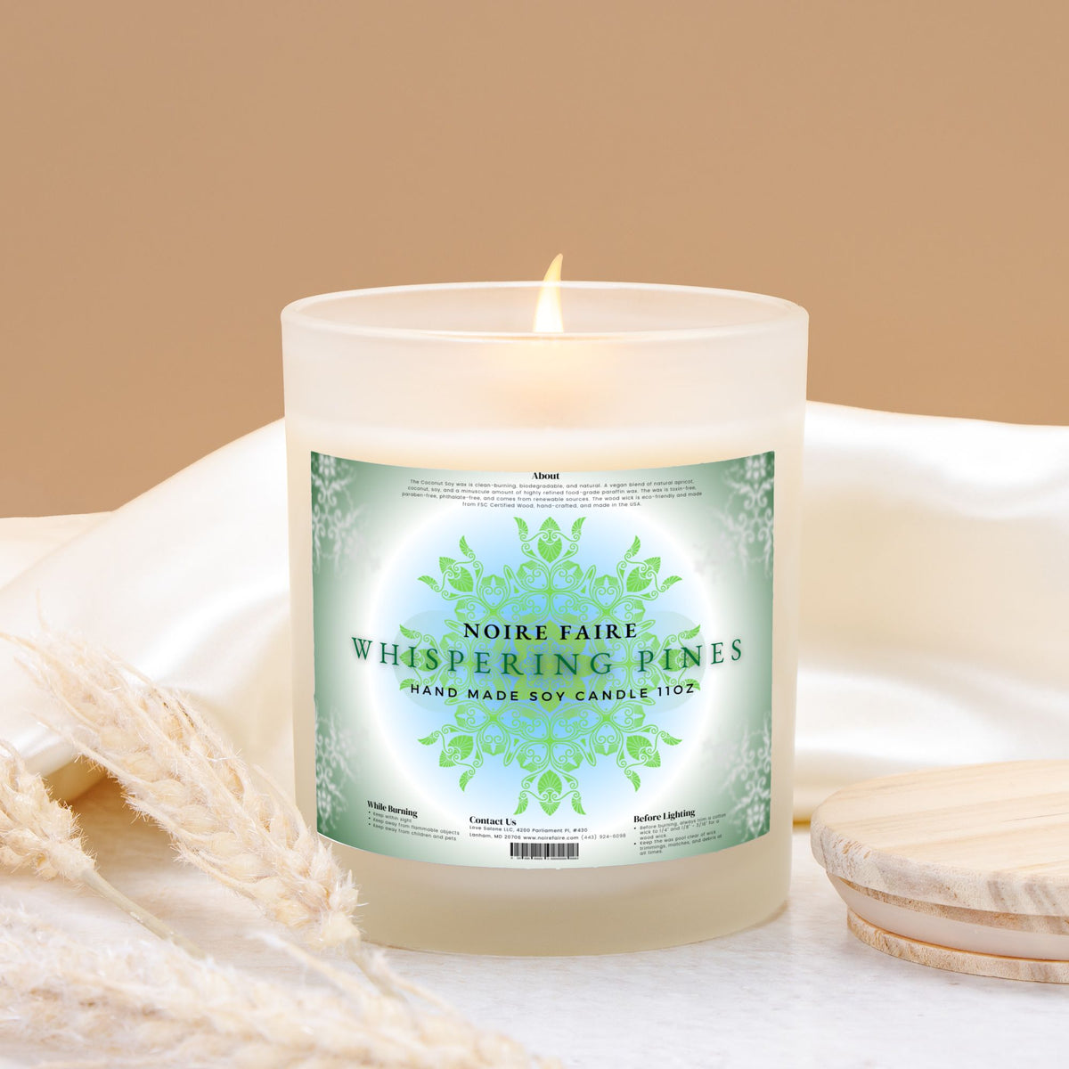 Keywords: Whispering Pines candle, winter candle, forest candle, pine candle, cedarwood candle, eucalyptus candle, coconut soy candle, vegan candle, non-toxic candle, frosted glass candle, wood wick candle, Noire Faire, hand-poured candle, made in the USA, eco-friendly candle.